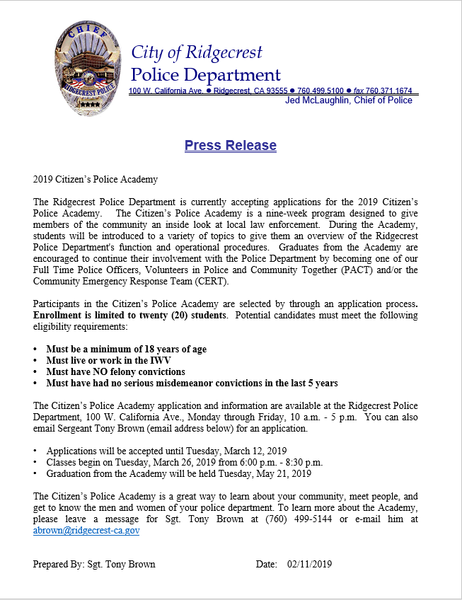 The Citizen’s Police Academy application and information are available at the Ridgecrest Police Department, 100 W. California Ave., Monday through Friday, 10 a.m. – 5 p.m. You can also email Sergeant Ryan Marrone (rmarrone@ridgecrest-ca.gov) for an application.